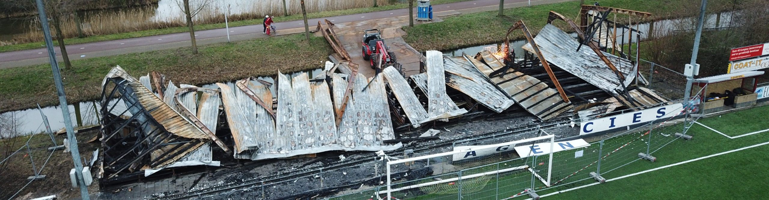 Op vrijdag 8 januari legde een verwoestende brand de 50 jaar oude tribune van SV. TOGB in as. Ook op het kantoor van Mustang Demolition kwam het trieste nieuws binnen. Een aantal van de medewerkers van Mustang Demolition zijn (voor de corona periode) wekelijks op de club te vinden, of zijn nauw betrokken geweest bij de toenmalige bouw van de tribune. Daarom werd er meteen nagedacht over hoe Mustang Demolition met hun expertise TOGB een handje zou kunnen helpen. Op zondagochtend werd meteen de plek des onheils bezocht om een inventarisatie te maken van de mogelijkheden. Na wat contact tussen Mustang Demolition en het bestuur van TOGB, werd er besloten dat Mustang op maandag 18 januari zou beginnen met de werkzaamheden.