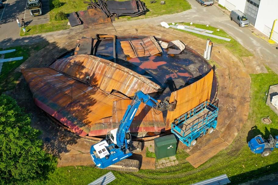 Bei Agrocare in Middenmeer haben wir einen vertikalen Wärmespeichertank (Ø 25 m, Höhe 12,5 m, ca. 6.000 m³ Fassungsvermögen) fachmännisch abgebaut. Der Tank wurde wegen Undichtigkeit entfernt. Der bestehende Betonboden bleibt erhalten und wird für den Einbau eines neuen Wärmespeichers wiederverwendet.