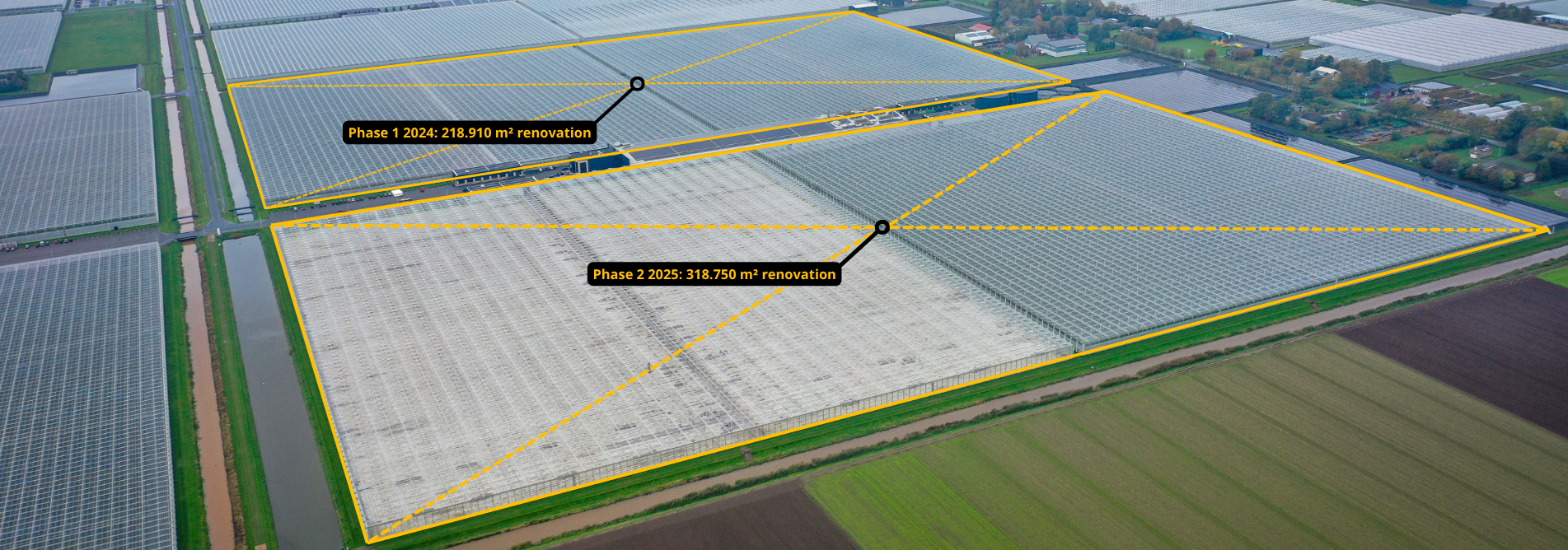 Après une première phase l’année dernière, au cours de laquelle nous avons rénové 22 hectares de serre en seulement une semaine et demie, nous sommes allés encore plus loin cette année avec la rénovation de 32 hectares supplémentaires.